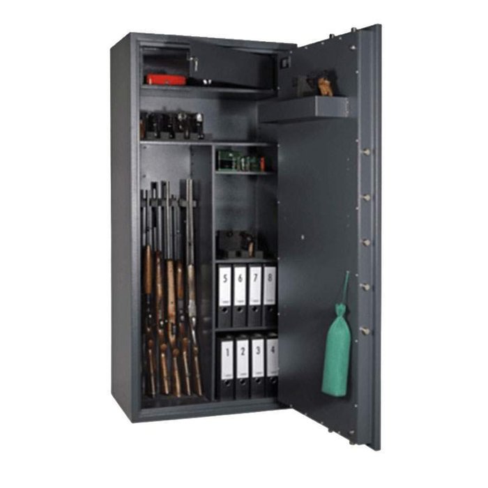 Die massiven Waffenschränke aus der Serie Cervo von Format gewährleisten eine hochsichere und gesetzeskonforme Aufbewahrung unbegrenzt vieler Lang- und Kurzwaffen sowie der entsprechenden Munition. Das Modell V Kombi verfügt über 7 Waffenhalter, 1 Ablagefach an der Türinnenseite und insgesamt 4 Fachböden (1x oben, 3x seitlich)